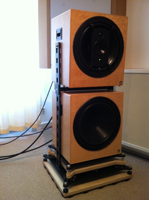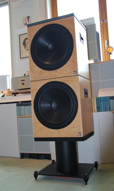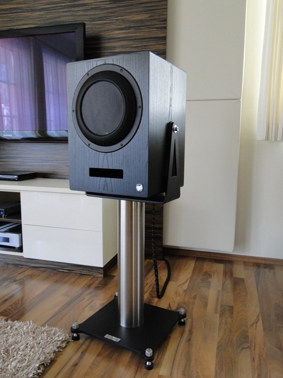 Der Turm mit den beiden Subwoofern Geithain Basis 14k sieht mit dem dicken Rohr schöner proportioniert und noch stabiler aus.